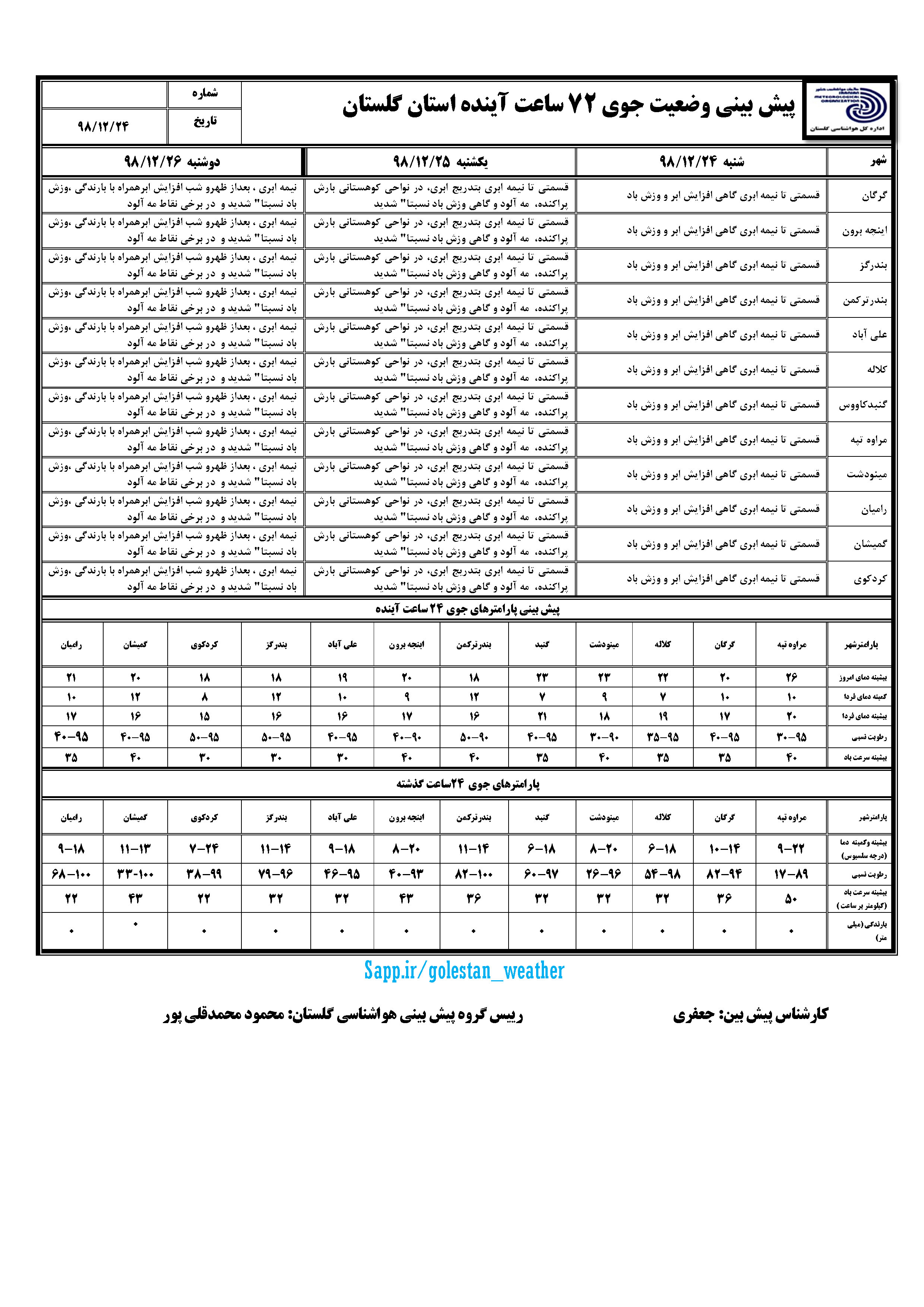 مدیرکل هواشناسی گلستان از ناپایداری هوا و کاهش دمای هوا از یکشنبه در این استان خبر داد.