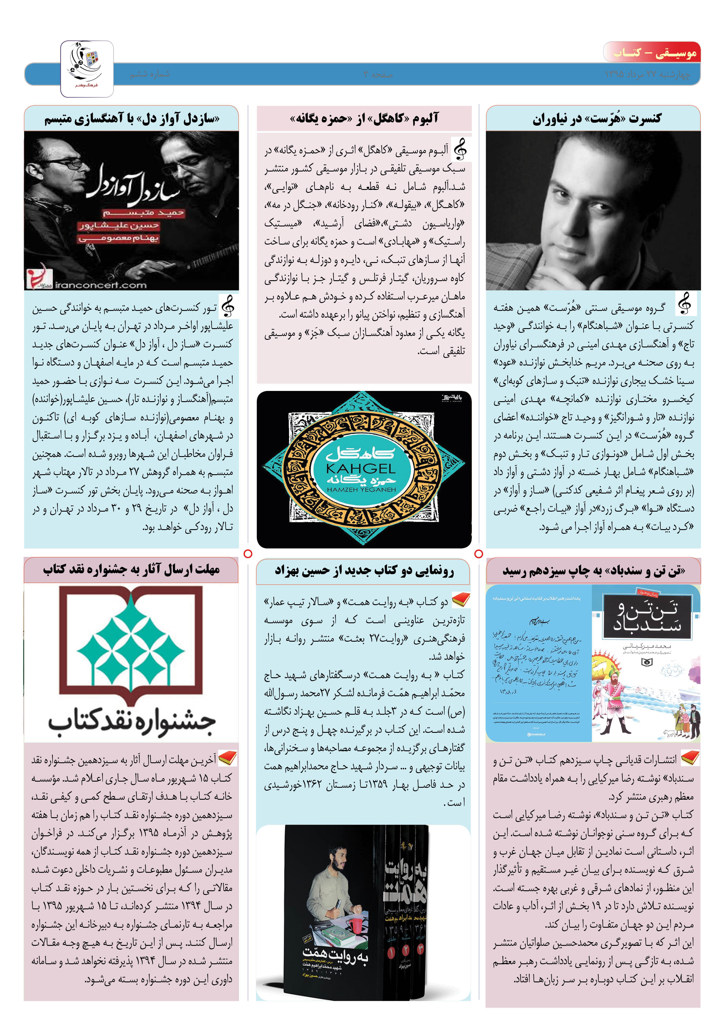 شماره ششم ویژه نامه فرهنگ و هنر با صفحات سینما، تئاتر ـ تلویزیون، موسیقی ـ کتاب و عکس منتشر شد.