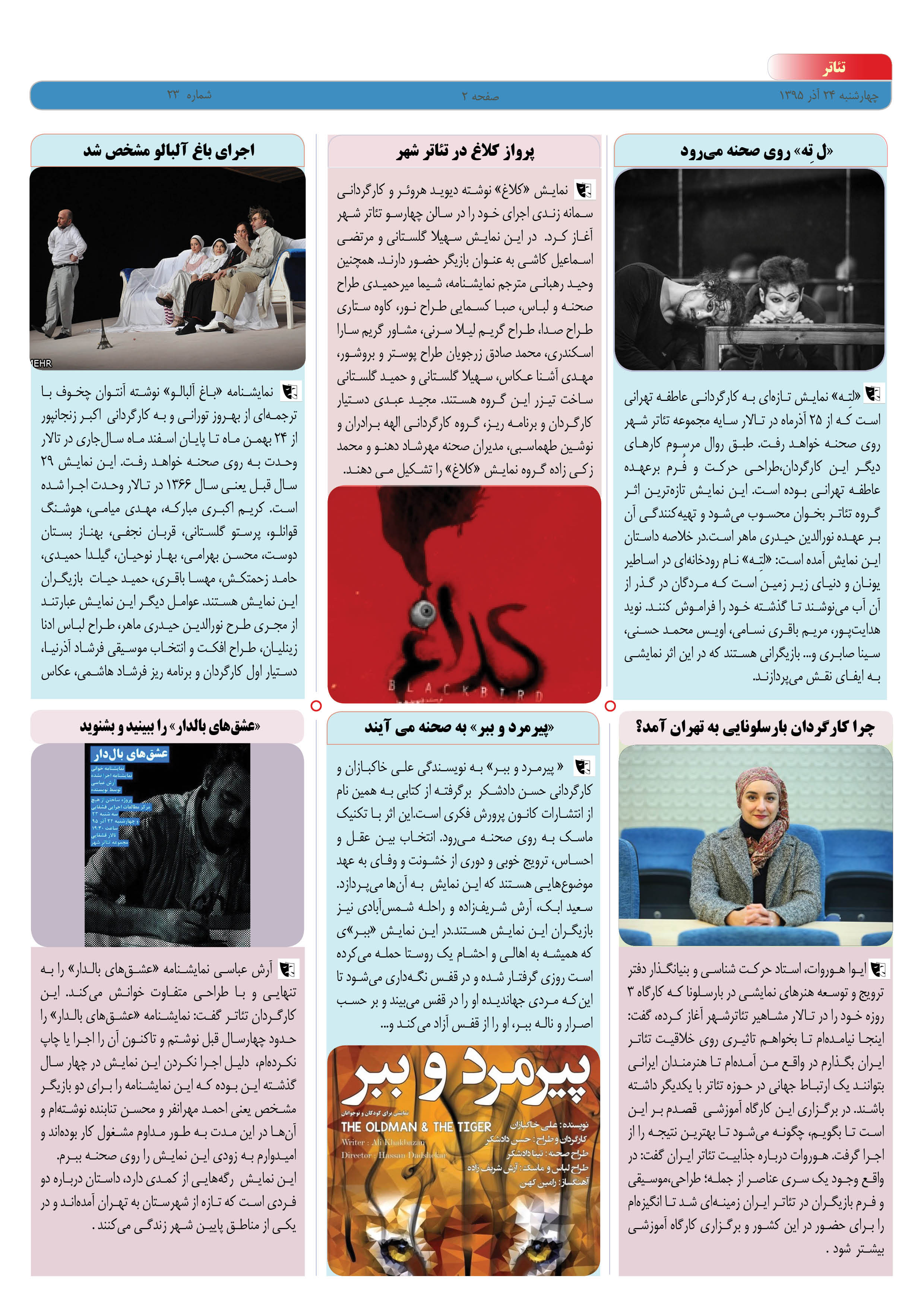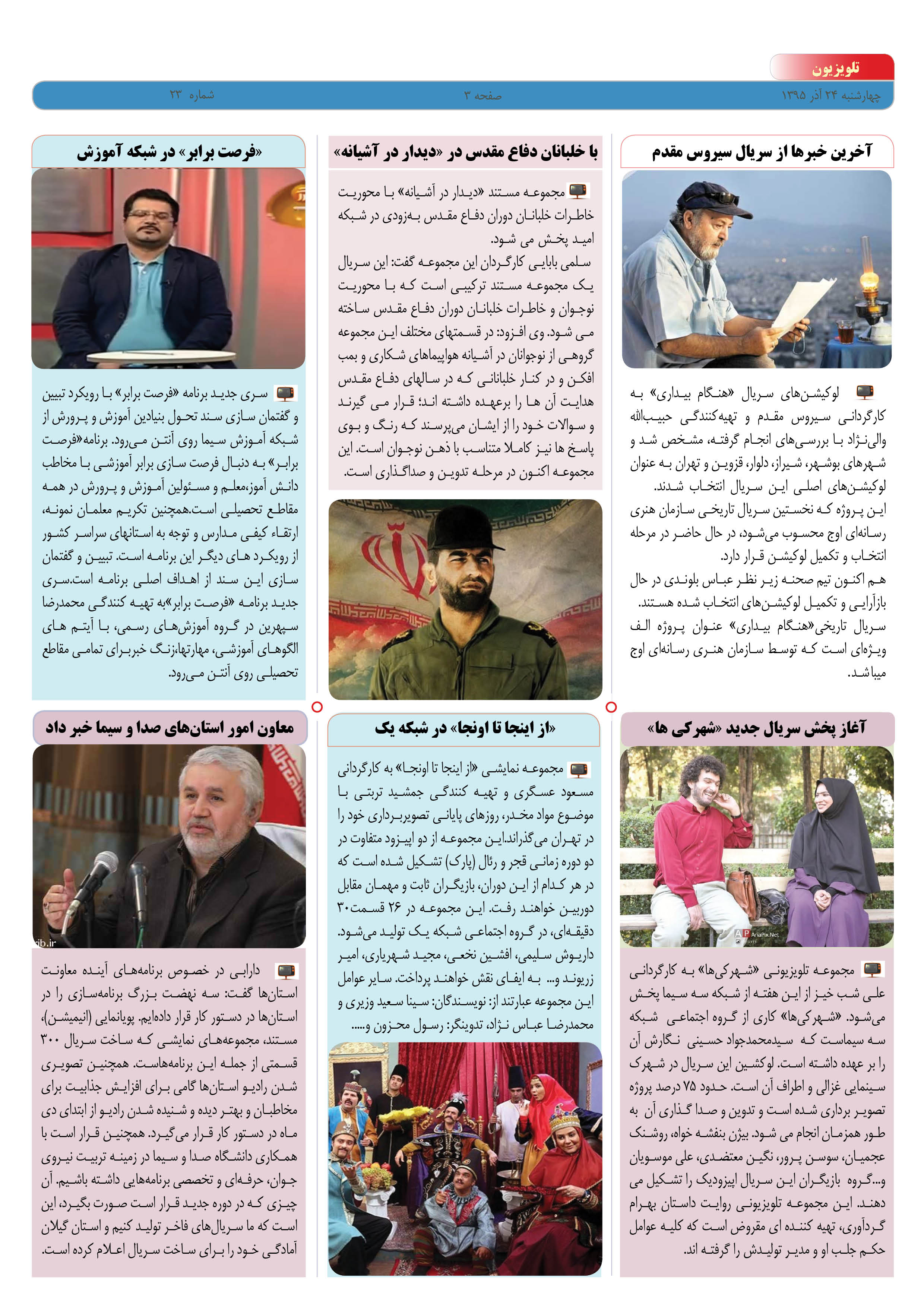 شماره بیست و سوم ویژه نامه فرهنگ و هنر با صفحات سینما، تئاتر، تلویزیون، موسیقی، کتاب و عکس منتشر شد.