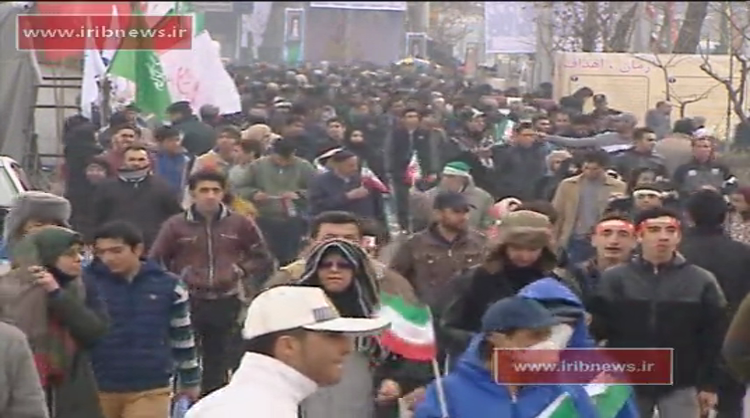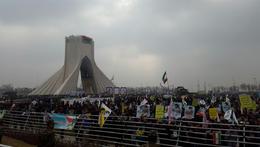 راهپیمایان درحالی که فریادی های مرگ بر آمریکا، مرگ بر اسرائیل و مرگ بر انگلیس سر می دهند با شور و نشاط در حال حرکت به سمت میدان آزادی هستند.