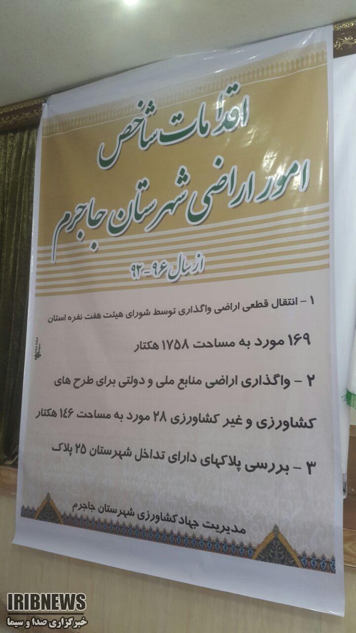 به گزارش خبرگزاری صدا و سیما رئیس سازمان جهادکشاورزی خراسان شمالی در مراسم اهدای سند مالکیت به کشاورزان شهرستاناهدای سند مالکیت هزار و 904 هکتار زمین به کشاورزان جاجرم گفت: امروز، علاوه بر انتقال قطعی هزار و 758 هکتار از اراضی، 146 هکتار اراضی منابع ملی و دولتی برای اجرای طرح های کشاورزی و غیرکشاورزی واگذار شد.
