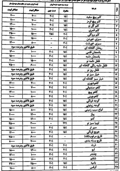 به گزارش خبرگزاری صدا و سیما، مرکز فارس، بر اساس اعلام سازمان اتحادیه میوه و تره بار، نرخ انواع میوه و تره بار در شیراز تا اطلاع ثانوی به شرح زیر است.