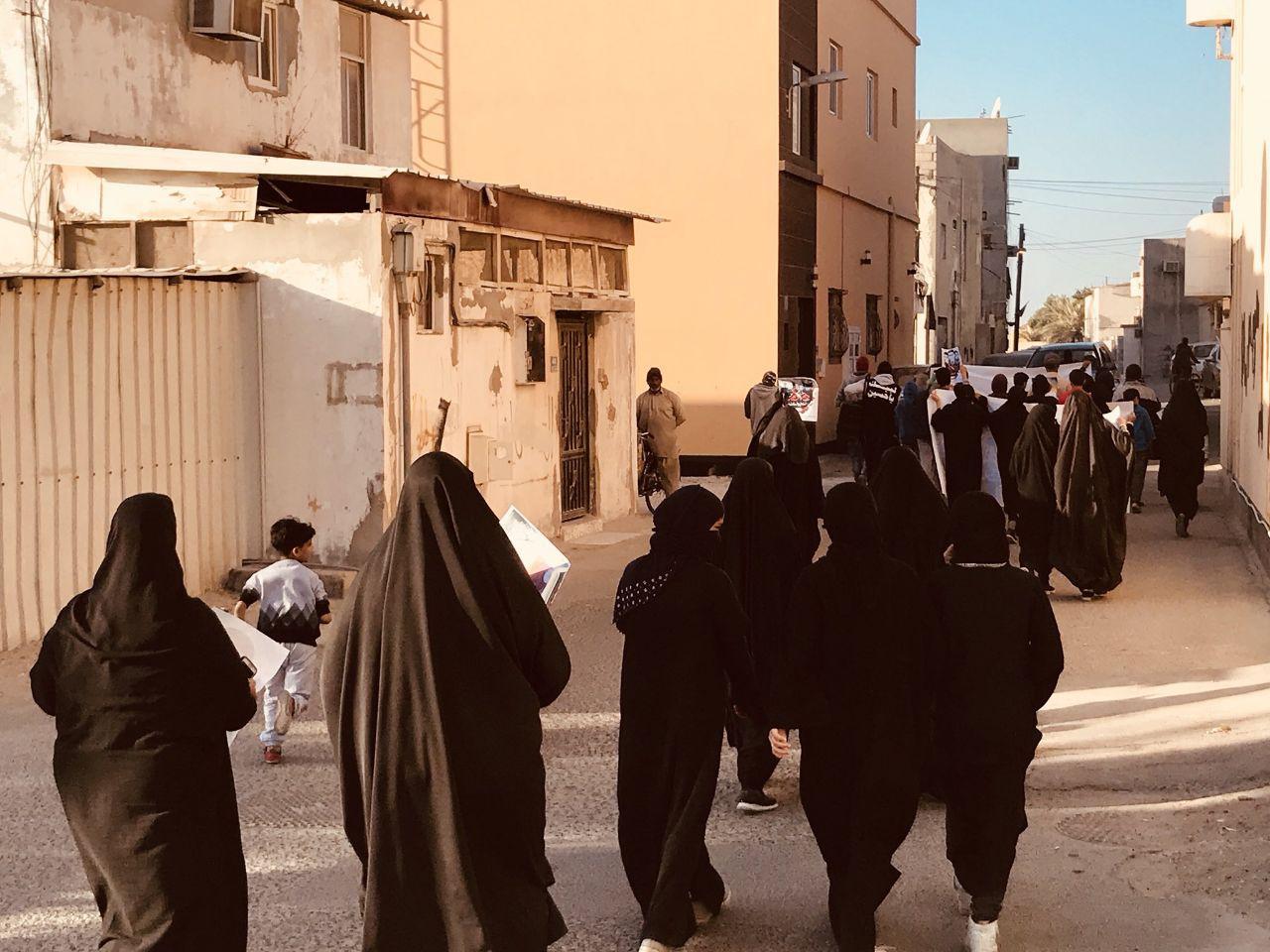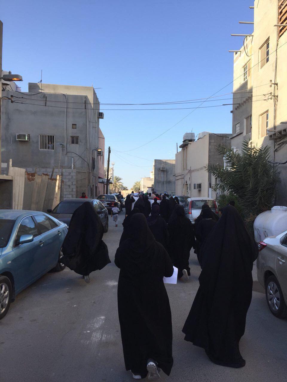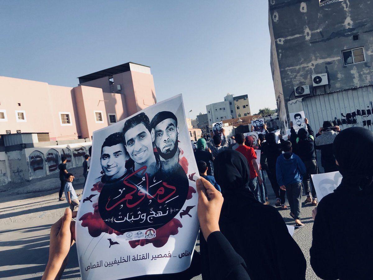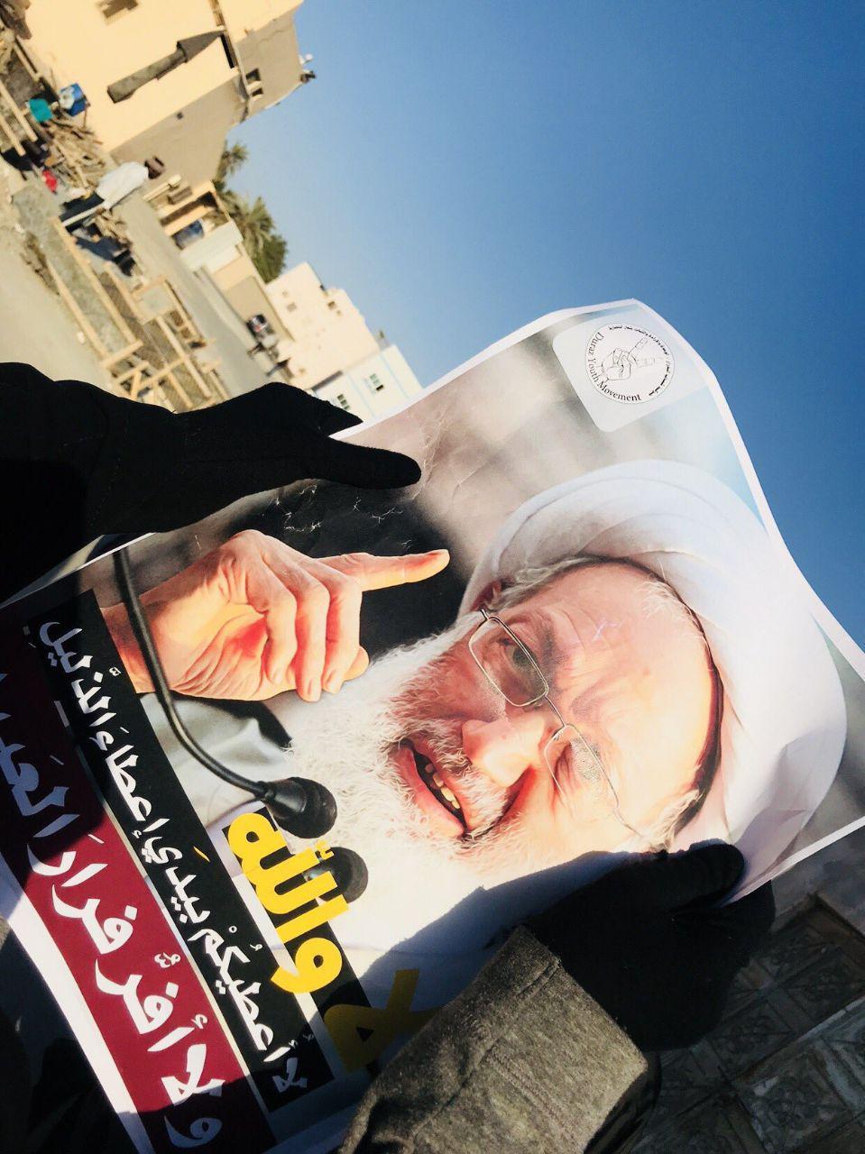 مردم با در دست داشتن تصاويري از آيت الله عيسي قاسم، 3 شهيد تيرباران شده و يکي از شهداي دهه نود اين منطقه، عليه پادشاه بحرين و نظام آل خليفه شعارهايي سر داده و خواستار قصاص وي شدند. مردم همچنين ادامه بازداشت خانگي غير قانوني و محاصره منزل آيت الله عيسي قاسم را محکوم کردند.