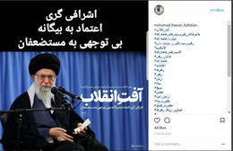 رهبر انقلاب آفت انقلاب را اشرافی گری ،اعتماد به بیگانه و بی توجهی به مستضعفان می داند. این سخن آیت الله العظمی خامنه ای در فضای مجازی بازتاب فراوانی داشته است .