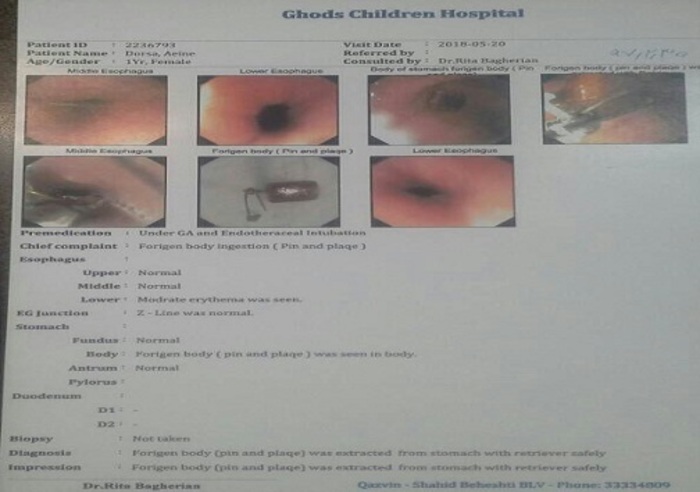 وی همچنین گفت: شیر خوار ده ماهه‌ای از کرمانشاه به دلیل خوردن سنجاق قفلی همراه با شی فلزی با محتوای ادعیه به این مرکز منتقل شد که جسم خارجی از طریق آندوسکوپی با موفقیت خارج شد.