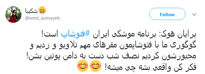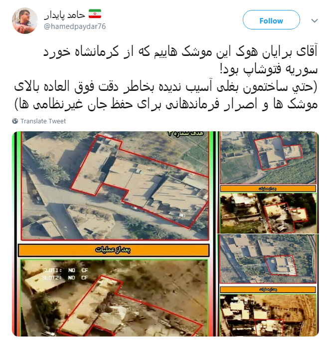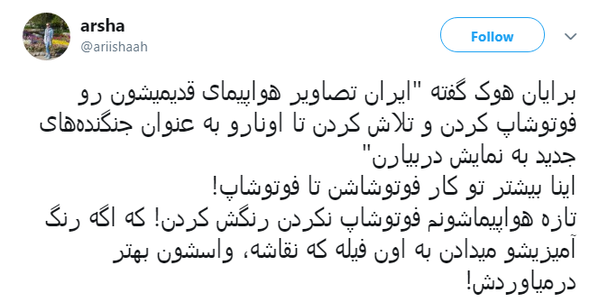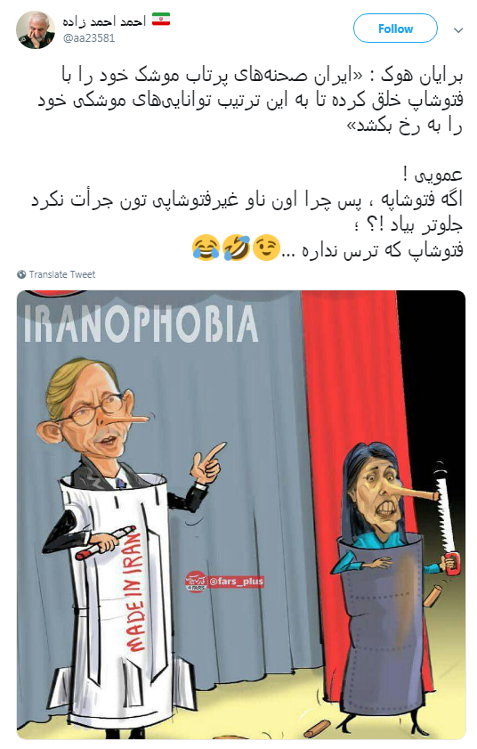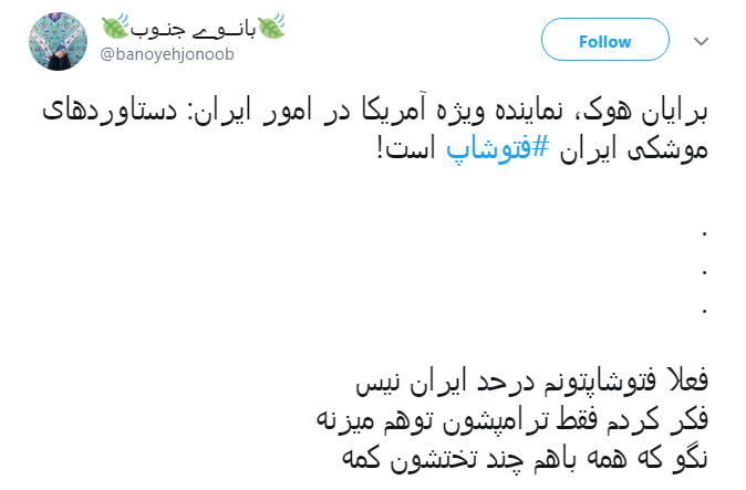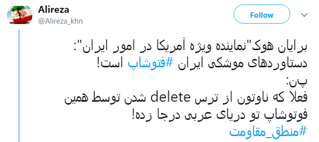 برایان هوک مدعی شد که ایران تلاش دارد مردم را طوری فریب دهد که گمان کنند آنان در سمت خیر قرار دارند و آمریکا متجاوز است! نماینده ویژه آمریکا در امور ایران برای اثبات مدعای بیاساس خود گفت: «ایران تصاویر پرتاب موشکهای خود را فوتوشاپ کرده تا نشان دهد تواناییاش در این زمینه بالا رفته است. آنان همچنین کوشیدهاند هواپیمایی قدیمی را با فتوشاپ بهعنوان جنگندههای جدید جاسوسی نشان دهند!»