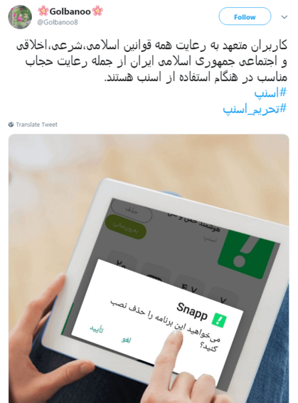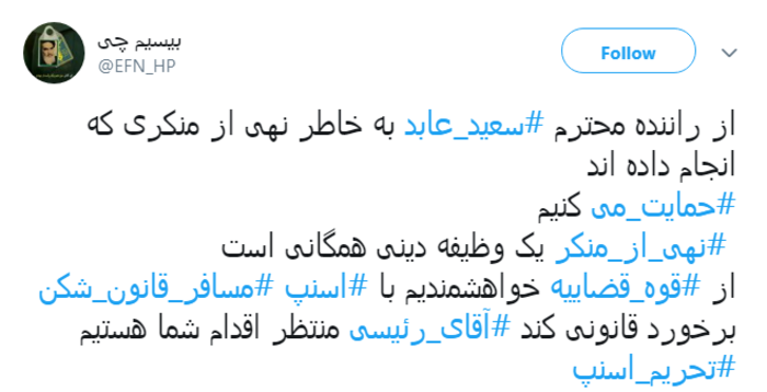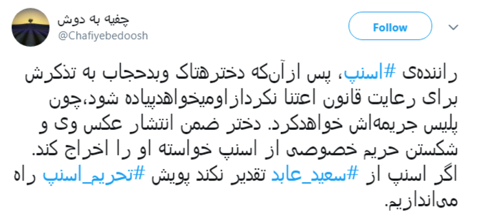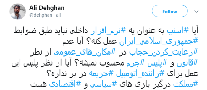 راننده اسنپ هم در مصاحبه اي علت تذکر خود را به سرنشين خود ،‌قانون اعلام نموده است و بيان داشته است که پليس او را جريمه خواهد کرد . براساس اظهارات راننده این خودرو، او صرفاً از مسافر خود خواسته بود تا حجاب خود را براساس قانون خود اسنپ رعایت کند اما این مسافر با زیرپا گذاشتن قانون هنجارشکنی کرد و حاضر نشد حجاب خود را رعایت کند.