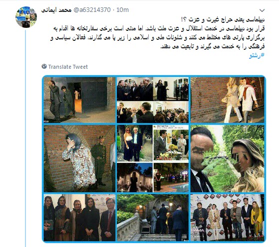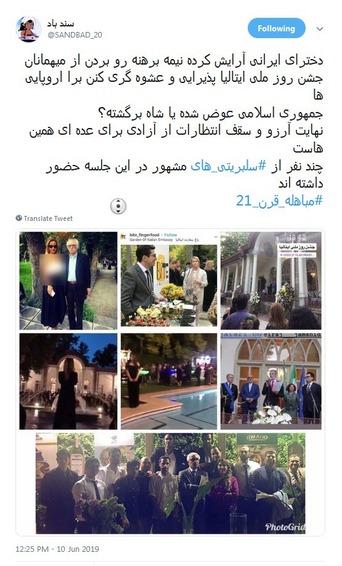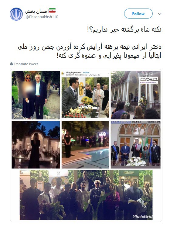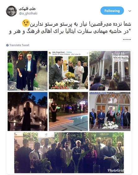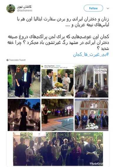 کاربران فضای مجازی درباره برگزاری پارتی مختلط در سفارت ایتالیا و حضور زنان نیمه‌برهنه در این جشن واکنش نشان دادند.