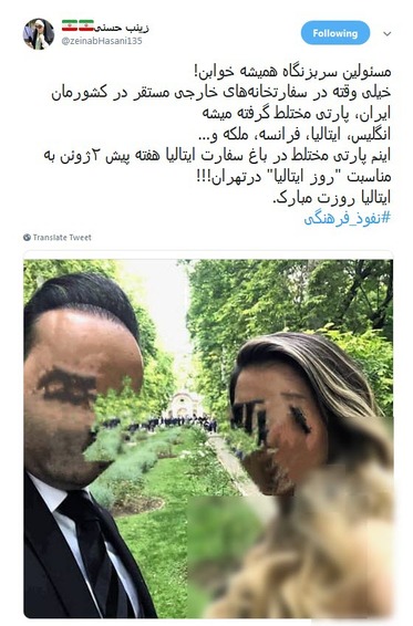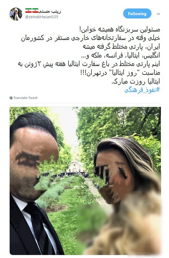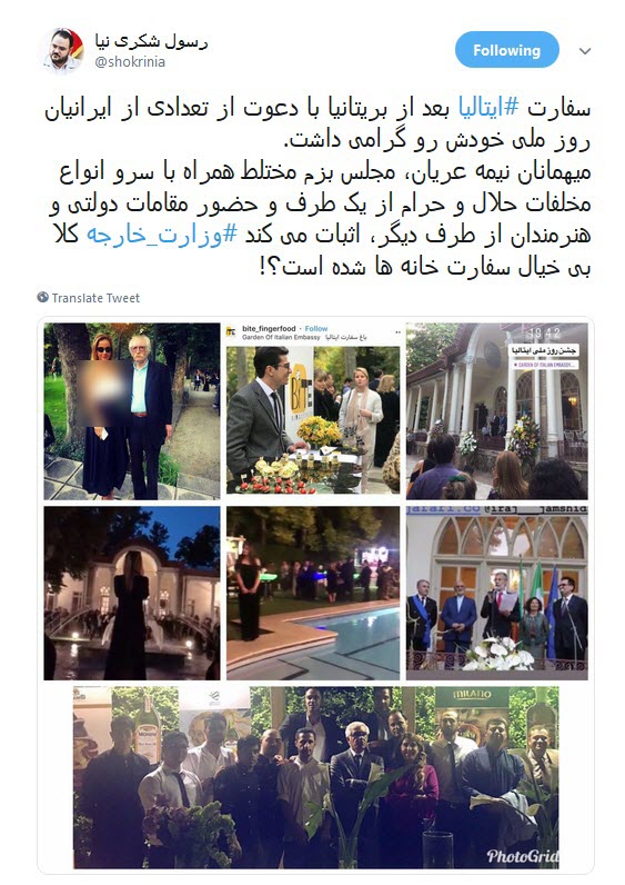 به گزارش سرويس فضاي مجازي خبرگزاري صدا و سيما ؛ همزمان با روز ملی ایتالیا؛ سفارت ایتالیا در ایران اقدام به برگزاری جشنی به این مناسبت در باغ این سفارت کرد. اما این مهمانی که به سبک و سیاق پارتی‌های مختلط غربی‌ها برگزار شده بود حواشی زیادی را به بار آورد. حضور زنان نیمه‌عریان و سرو برخی از نوشیدنی‌های حرام در این جشن هنجارشکنی و قانون‌شکنی بزرگی است که باید با آن برخورد شود.