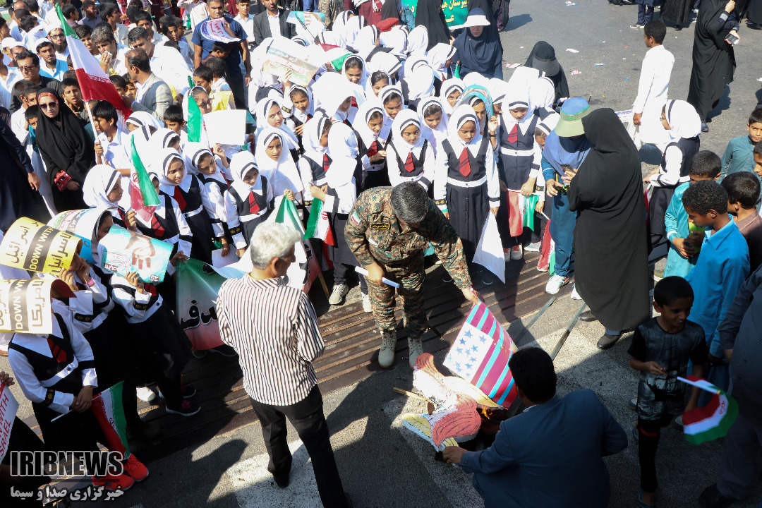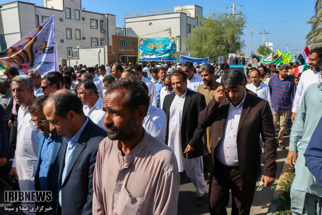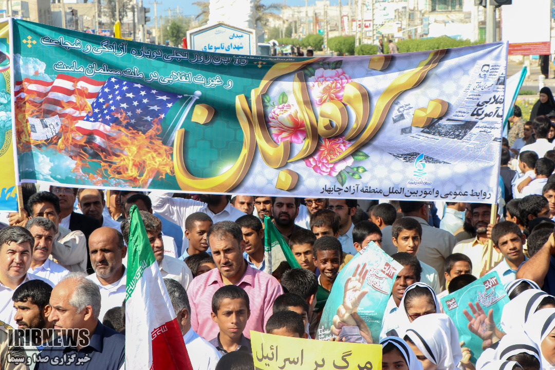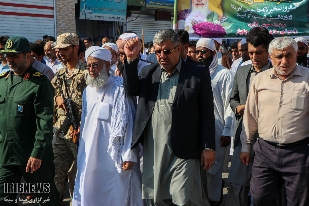به گزارش خبرگزاری صداوسیما مرکز سیستان و بلوچستان، در راهپیمایی روز ملی مبارزه با استکبار، اقشارمختلف مردم شیعه و سنی سیستان و بلوچستان با حمل پارچه نوشته هایی در گرامیداشت این روز تاریخ ساز، شعار مرگ بر آمریکا، مرگ بر اسرائیل و مرگ بر آل سعود سردادند.