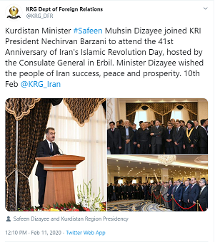 حساب کاربری نهاد روابط خارجی اقلیم کردستان در عراق طی توئیتی نوشته است، "صفین دزه یی" مسئول نهاد روابط خارجی اقلیم کردستان به "نچیروان بارزانی"، رئیس اقلیم ملحق شد تا در مراسم چهل و یکمین سالگرد پیروزی انقلاب اسلامی ایران به میزبانی کنسولگری این کشور در اربیل شرکت کند. دزه یی برای مردم ایران آرزوی موفقیت، صلح و کامیابی دارد.