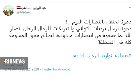 کاربری هم نوشت: «بیایید پیروزیهای امروز را جشن بگیریم؟! بیایید برای بزرگمردان انصارالله پیام تبریک بفرستیم، زیرا این پیروزیها به نفع محور مقاومت در سراسر منطقه است.»