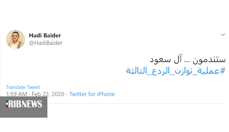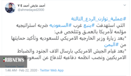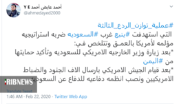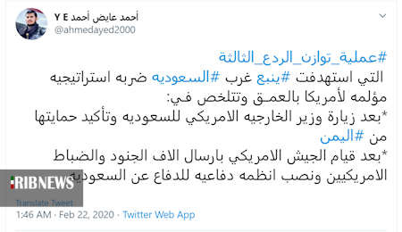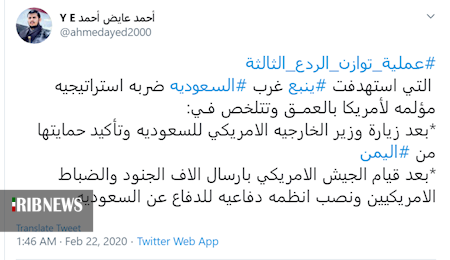 کاربر دیگری نوشت: «عملیات توازن بازدارندگی سوم که ینبع را در غرب عربستان هدف قرار داد، ضربه راهبردی دردناک به آمریکا است، زیرا این حمله پس از سفر وزیر خارجه آمریکا به عربستان و تاکید بر حمایت از این کشور در برابر یمن و نیز پس از اقدام ارتش آمریکا به اعزام هزاران سرباز و افسر و استقرار سامانههای دفاعی به منظور دفاع از عربستان صورت گرفت.»