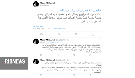 یک کاربر نوشت: «نیروهای موشکی و پهپادی ارتش یمن در عملیاتی منحصر به فرد هشت مکان را در عمق شهر صنعتی عربستان در ینبع هدف قرار دادند. بنابراعلام منابع نظامی صنعا، پایانه صادرات نفت، پالایشگاه آرامکو که روزانه تقریبا دو میلیون و پانصد هزار بشکه نفت تولید میکند، کارخانه تولید گاز طبیعی و بندر ینبع که روزانه ظرفیت صادرات سه میلیون بشکه نفت و نیز صادرات فرآوردههای نفتی و پتروشیمی را دارد از جمله این مکانها هستند.