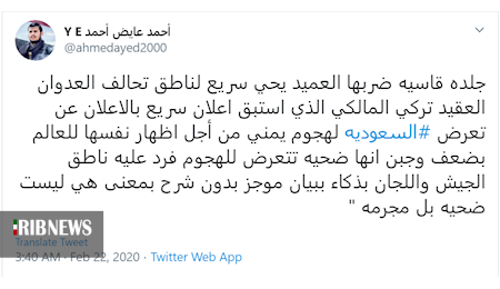 احمد عایض احمد در توئیتی دیگر افزود: «یحیی سریع یک سیلی محکم به ترکی المالکی، سخنگوی ائتلاف متجاوز به یمن زد. ترکی المالکی فورا اعلام کرد عربستان هدف حمله یمنیها قرار گرفته است تا از روی ضعف و ترس این گونه وانمود کند که قربانی یک حمله شده است، اما سخنگوی ارتش و کمیتههای مردمی در اقدامی هوشمندانه در بیانیهای مختصر و بدون طول و تفصیل به وی پاسخ داد و مضمون بیانیه این بود که او قربانی نیست بلکه جنایتکار است.»
