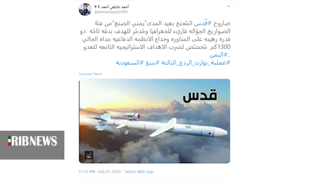 احمد عایض احمد در توئیتی دیگر درباره موشک قدس نوشت: «موشک بالدار دوربرد قدس ساخت یمن و از خانواده موشکهای کروز مجهز به GPS است. این موشک با نهایت دقت هدف را نابود میکند، توانایی زیادی برای مانور و فریب دادن سامانههای دفاعی دارد. برد آن هم اکنون به ۱۳۰۰ کیلومتر میرسد و ویژه نشانه گرفتن اهداف راهبردی دشمن است.»