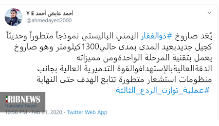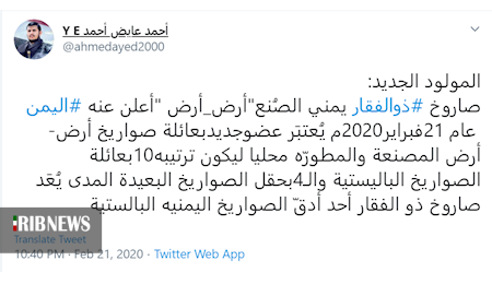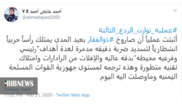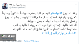 تحلیلگر یمنی در توئیتی دیگر نوشت: «موشک تازه تولید شده، ذوالفقار نام دارد. این موشک زمین به زمین ساخت یمن است که در تاریخ ۲۱ فوریه سال ۲۰۲۰ از آن رونمایی شد.