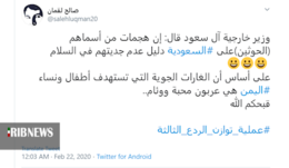کاربری دیگر هم با تمسخر نوشت: «وزیر خارجه آل سعود گفت: حملات به اصطلاح حوثیها به عربستان، نشانه جدی نبودن آنان در صلح است. انگار حملات هوایی به یمن که در آنها کودکان و زنان هدف قرار میگیرند، نشانه عشق و الفت است.»
