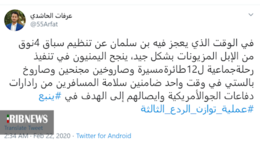 کاربری هم نوشت: «در شرایطی که بن سلمان از عهده سازمان دهی مسابقات شترسواری به خوبی بر نمیآید، یمنیها موفق میشوند پرواز گروهی همزمان ۱۲ پهپاد، دو موشک بالدار و یک موشک بالستیک را اجرا کنند و بدون آسیب دیدن در برابر رادارهای پدافند هوایی آمریکا به هدف در ینبع اصابت کنند.»
