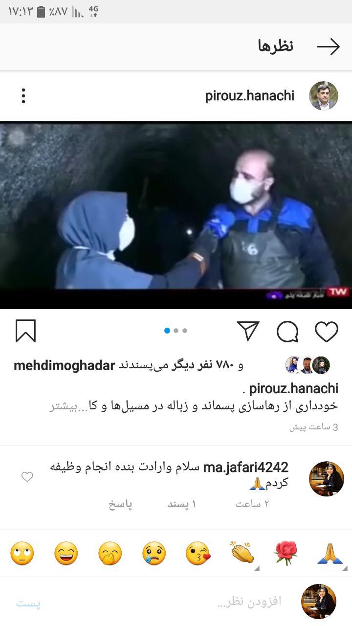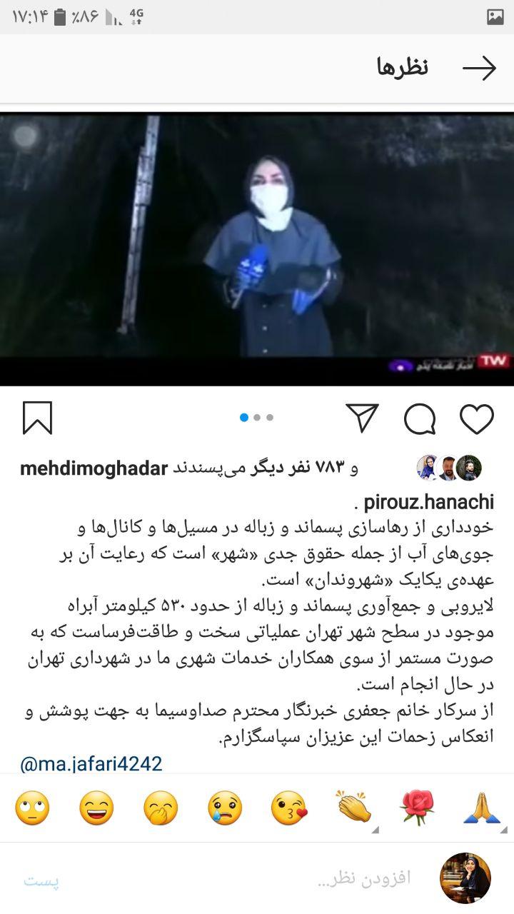 به گزارش خبرگزاری صدا و سیما؛ پیروز حناچی در فضای مجازی از گزارش «۱۶- زیرزمین» خانم مریم جعفری خبرنگار خبرگزاری صدا و سیما؛ که به خوبی سختی کار کارگران شهرداری را منعکس کرده بود، تشکر و قدردانی کرد.