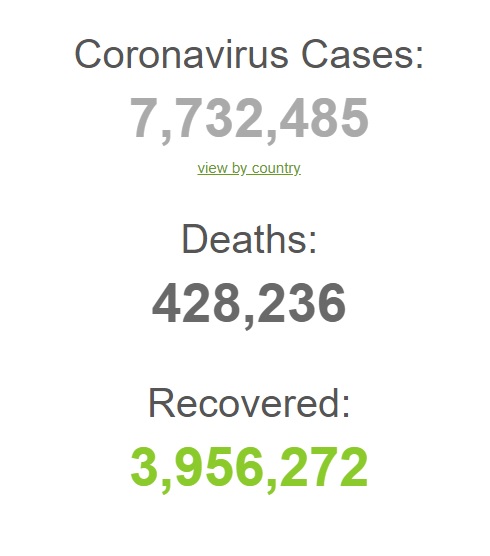 تاکنون در جهان ۷ میلیون و ۷۳۲ هزار و ۴۸۵ نفر به ویروس کرونا مبتلا شده، ۳ میلیون و ۹۵۶ هزار و ۲۷۲ نفر بهبود یافته و ۴۲۸ هزار و ۲۳۶ نفر نیز جان باخته اند.