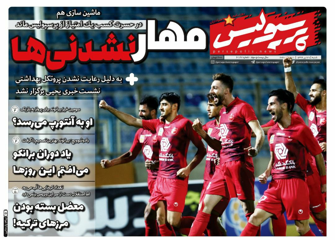به گزارش خبرگزاری صدا و سیما مرکز فارس؛ پرسپولیس دیشب ماشین سازی تبریز را شکست داد و ۵۶ امتیازی شد و نهایتا با ۲ پیروزی دیگر میتواند جشن قهرمانی بگیرد، اما آبی پوشان که اوضاع خوبی ندارند امشب با تیمی نصفه و نیمه باید به مصاف تراکتور پرانگیزه بروند. روزنامههای ورزشی امروز با توجه به مصاف حساس تیمهای تبریزی و تهرانی لیگ برتر اکثرا جلد خود را به این ۲ بازی اختصاص داده اند. جلد روزنامههای ورزشی امروز را ورق بزنید.