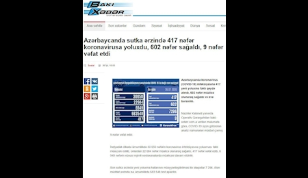 ئنی مساوات:- با ابتلای ۴۱۷ نفر دیگر به ویروس کرونا در جمهوری آذربایجان تعداد مبتلایان به این ویروس در این کشور از مرز ۳۰ هزار نفر گذشت و به ۳۰۰۵۰ نفر رسید. با مرگ ۹ نفر دیگر تعداد جان باختهها به ۴۱۷ نفر افزایش یافت.