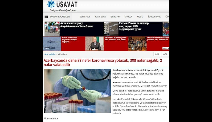 - تعداد مبتلایان به کرونا در جمهوری آذربایجان در آمار روزانه این کشور دو رقمی شد. ۸۷ مبتلا و دو فوتی در شبانه روز گذشته.