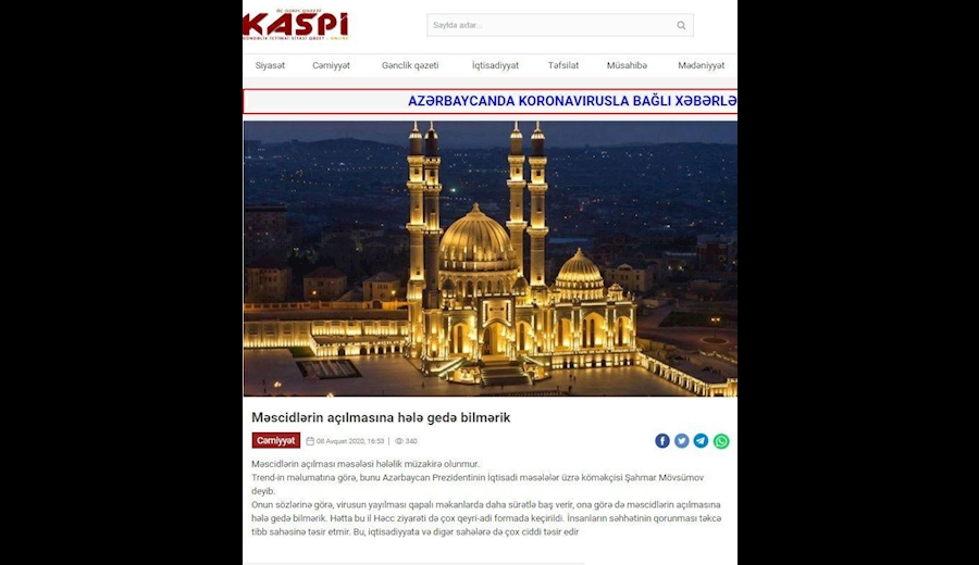 - دستیار اقتصادی رئیس جمهور آذربایجان: فعلا نمی‌توانیم در خصوص بازگشایی مساجد تصمیم بگیریم.