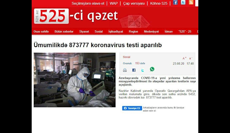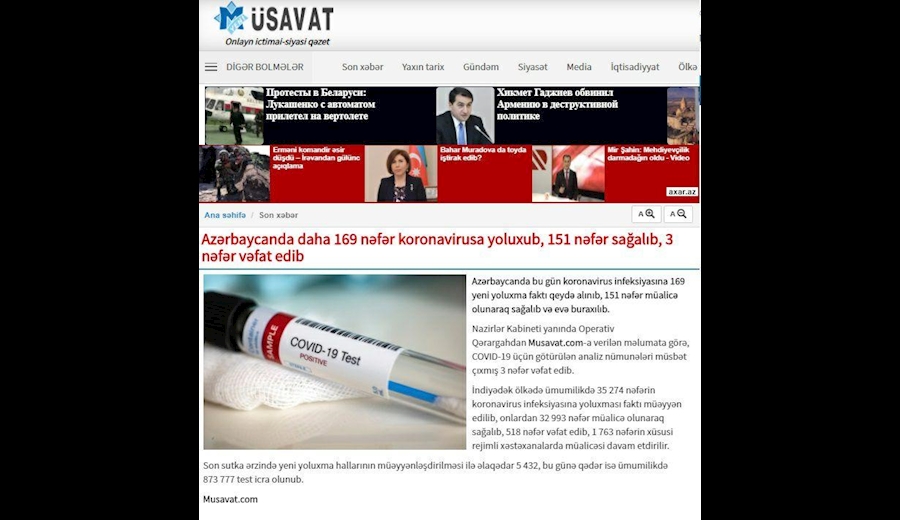 - در ۲۴ ساعت گذشته ۱۶۹ نفر دیگر در جمهوری آذربایجان به کرونا مبتلا شده و ۳ نفر دیگر جان باخته اند. مجموع مبتلایان در این کشور به ۳۵۲۷۴ نفر و مجموع جان باختهها به ۵۱۸ نفر رسید.