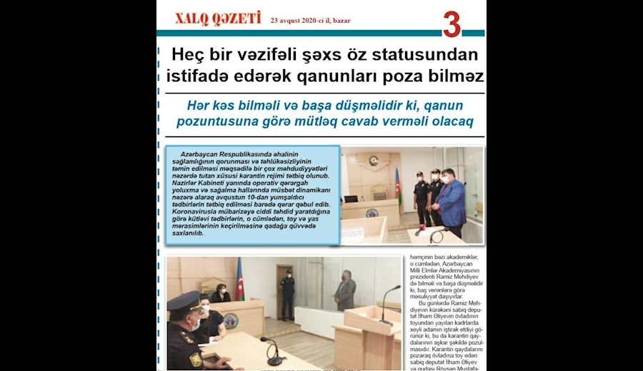 - در پی برپایی مراسم عروسی برای نوه "رامیز مهدی اف" رییس دفتر سابق ریاست جمهوری و رییس آکادمی علوم فعلی جمهوری آذربایجان در شرایط قرنطینهای و ممنوعیت برگزاری این مراسم داماد "مهدی اف" به ۱۵ روز حبس محکوم شد و تعدادی دیگر از جمله یک نماینده مجلس و رییس دفتر آمبودزمان جمهوری آذربایجان جریمه شدند.