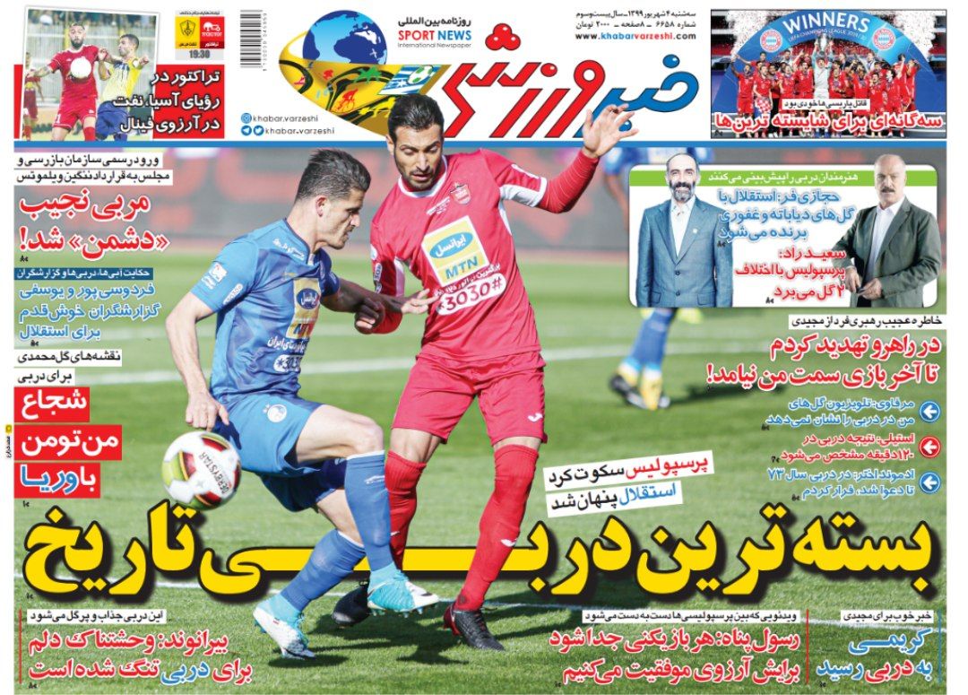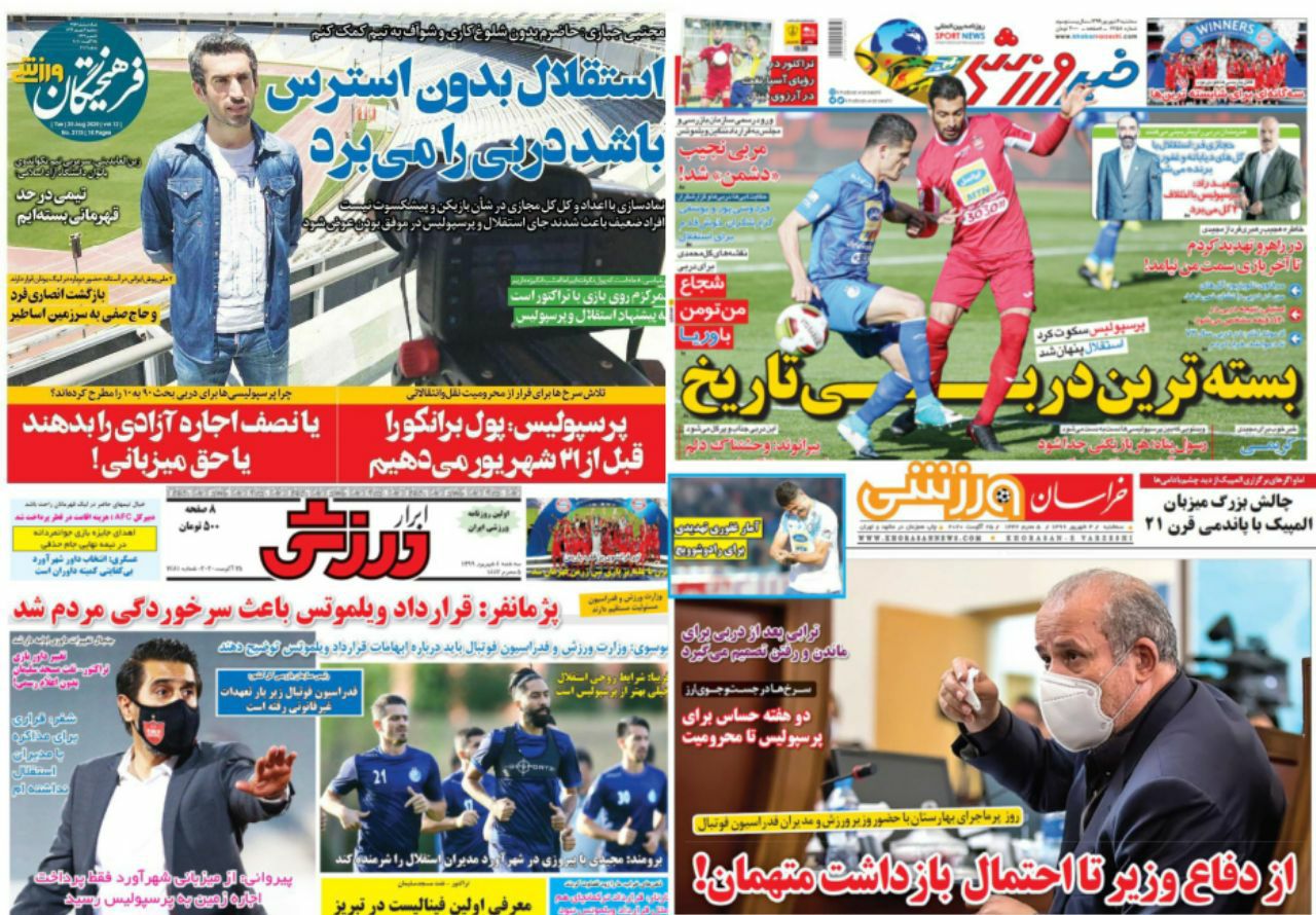 به گزارش خبرگزاری صداوسیما؛ دومین دیدار مرحله نیمه نهایی جام حذفی بین تیم های پرسپولیس و استقلال فردا در استادیوم آزادی برگزار می شود و حساسیت های این بازی و جذابیت آن برای تماشاگران باعث شده است روزنامه های ورزشی امروز بر روی جلد خود بیشترین تیتر را در خصوص این بازی داشته باشند.