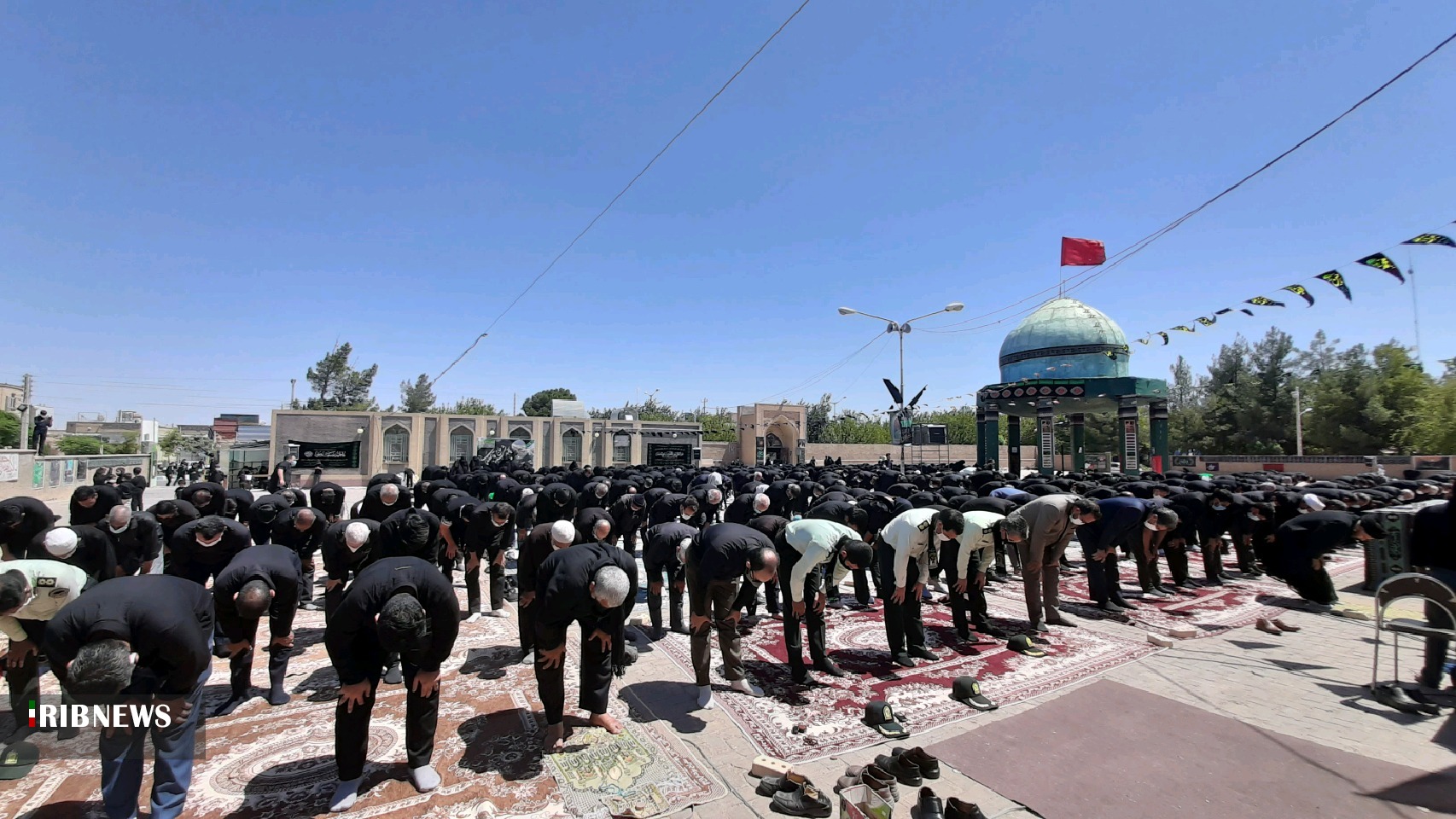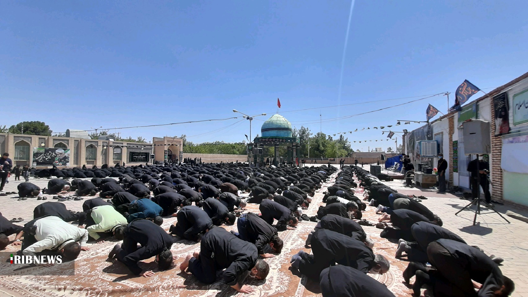 به گزارش خبر گزاری صداوسیما مرکز خراسان جنوبی ، مومنان عزادار پس از سوگواری سید و سالار شهیدان حضرت اباعبداله الحسین(ع) همزمان با طنین زیبای اذان به یاد آخرین نماز سیدالشهدا (ع) در روز عاشورا نماز ظهر را اقامه کردند.