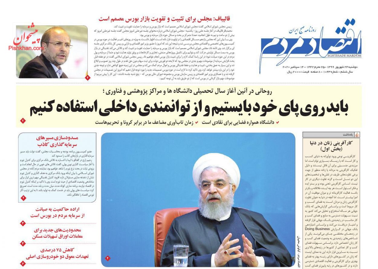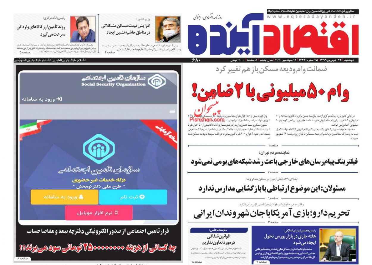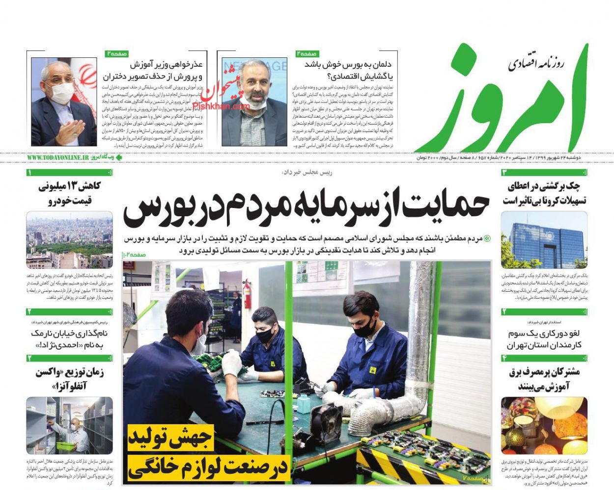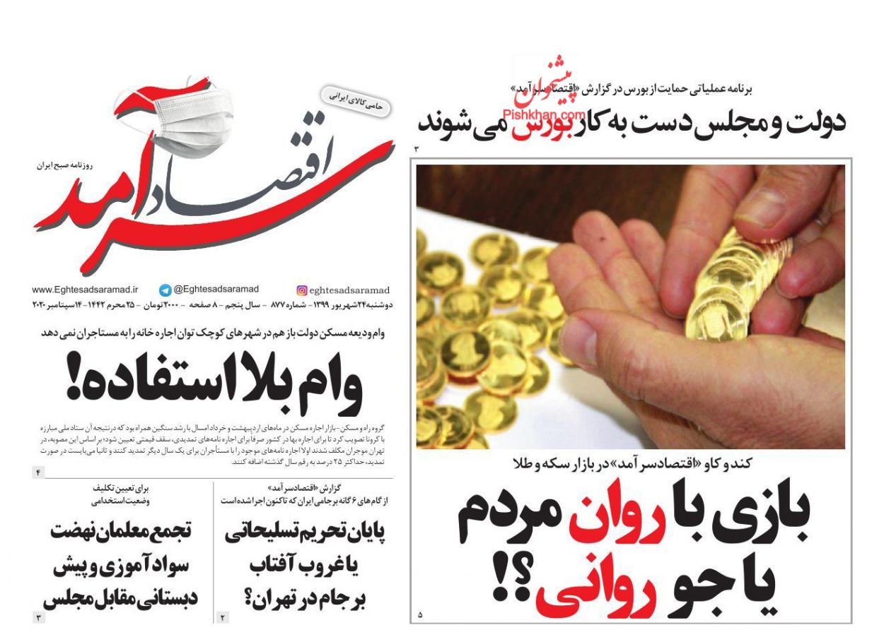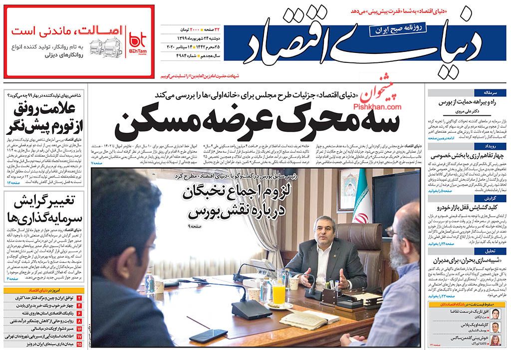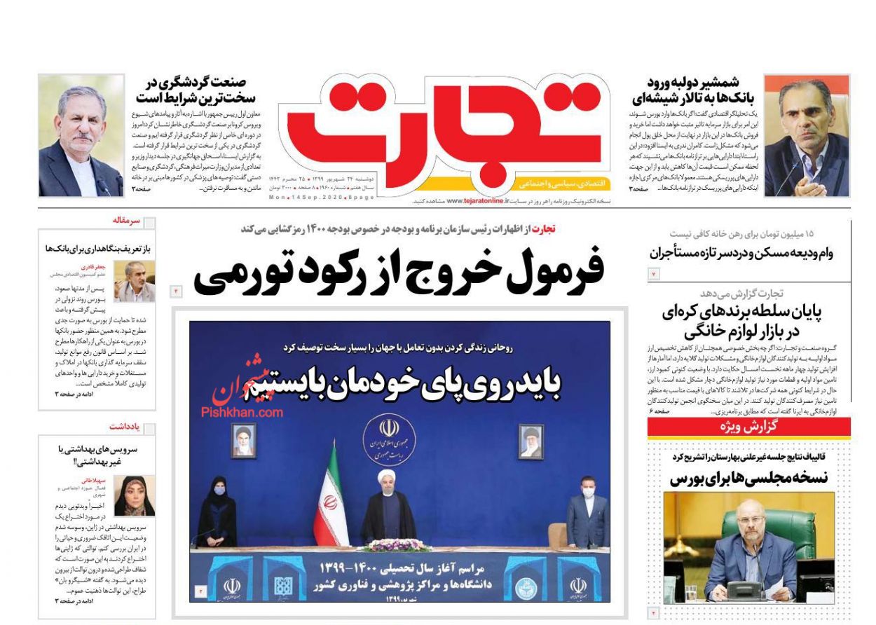 به گزارش گروه اقتصادی خبرگزاری صدا و سیما؛ صفحه نخست برخی روزنامههای اقتصادی امروز دوشنبه، ۲۴ شهریور ۹۹ به شرح زیر است: