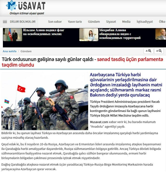 - ارتش ترکیه در آستانه ورود به جمهوری آذربایجان / رئیس جمهور ترکیه سند درخواست ورود ارتش ترکیه به جمهوری آذربایجان بر اساس توافق‌های قبلی طرفین به مدت یک سال را برای تأیید به مجلس ملی ترکیه ارائه داد.