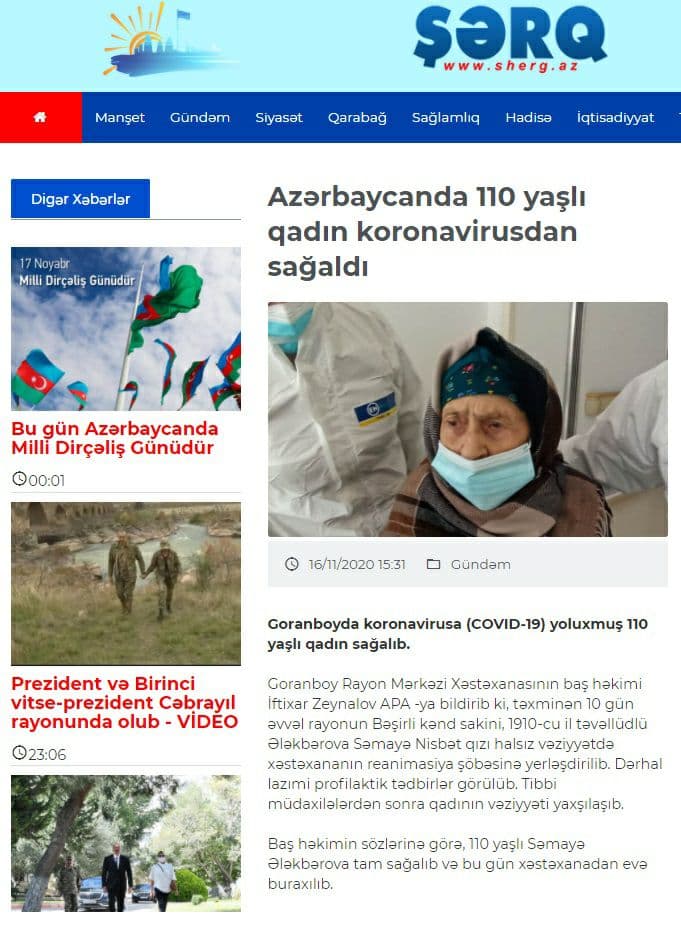 - پیرزن ۱۱۰ ساله مبتلا به کرونا در جمهوری آذربایجان بهبود یافته و از بیمارستان مرخص شد.