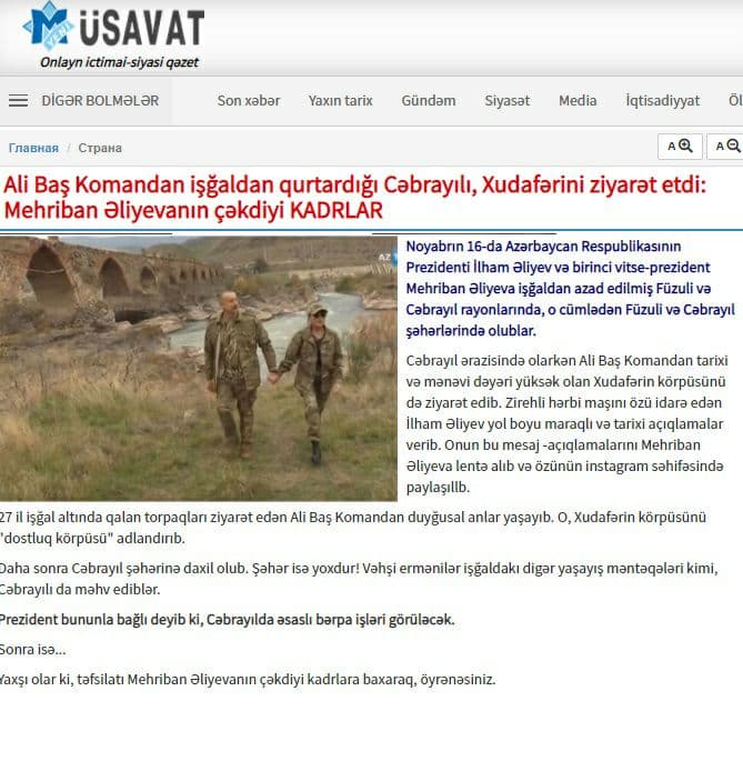 - رئیس جمهور و معاون اول رئیس جمهوری آذربایجان به مناطق تازه از اشغال آزاد شدۀ "فضولی، جبرائیل، خدافرین" سفر و از این مناطق بازدید کردند.
