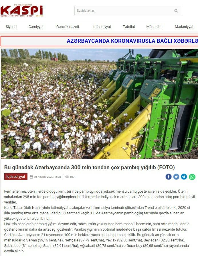 - تا کنون بیش از ۳۰۰ هزار تن پنبه از مزارع جمهوری آذربایجان برداشت شده است.