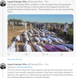 حساب توئیتری دبیر کل جنبش اسلامی نیجریه نوشت قاطعانه کشتار وحشتناک کشاورزان بی گناه بدست تروریست های مخوف را که به عنوان گروه «بوکوحرام» عرض اندام می کنند محکوم می کنیم.