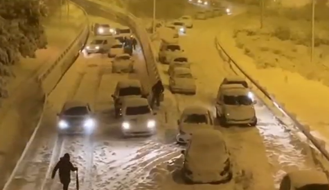 در ورودی شهر مادرید، دهها خودرو گرفتار شده اند. رانندگان میگویند به آب و هوای نامساعد تا این حد عادت ندارند.