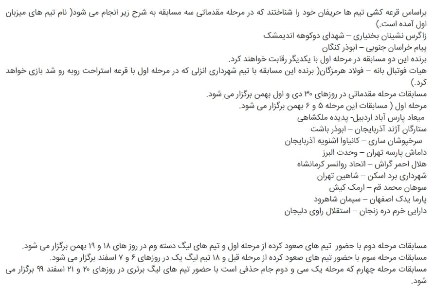بر اساس قرعه کشی انجام شده، در مرحله نخست این رقابتها که با شرکت تیمهای قهرمان جام حذفی استانها برگزار میشود تیم سرخپوشان ساری قهرمان رقابتهای حذفی استان مازندران به مصاف کانیاوا اشنویه آذربایجان غربی میرود.
