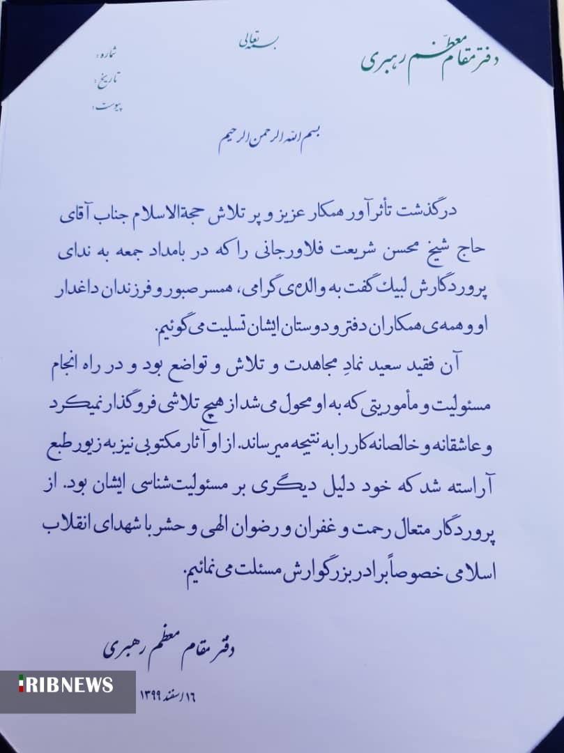 دفتر مقام معظم رهبری نیز با ارسال پیامی درگذشت این عالم ربانی را تسلیت گفت.