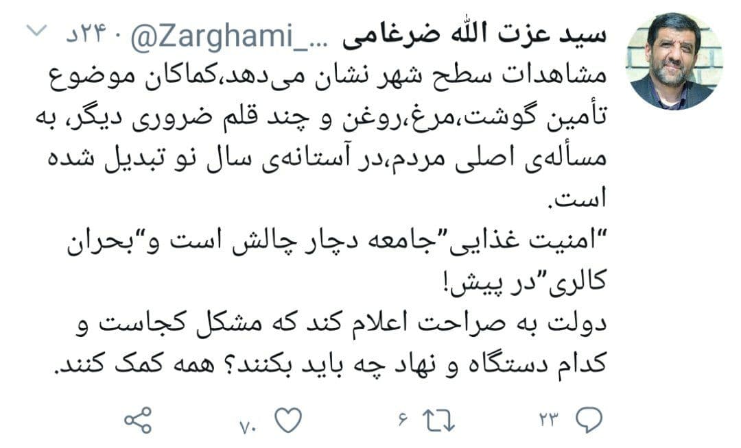 عضو شورای عالی انقلاب فرهنگی نوشت: کماکان موضوع تأمین گوشت، مرغ، روغن و چند قلم ضروری دیگر، به مسئله اصلی مردم، در آستانه سال نو تبدیل شده است.