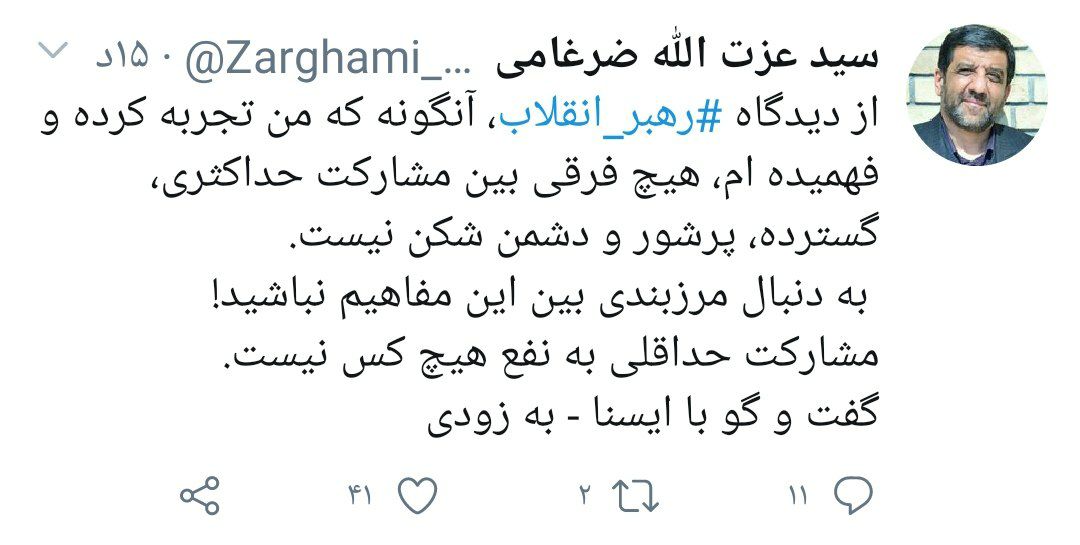 به گزارش گروه مجازی خبرگزاری صدا و سیما، سید عزت‌الله ضرغامی عضو شورا‌های عالی انقلاب فرهنگی و فضای مجازی در صفحه شخصی خود در توئیتر نوشت: ‏از دیدگاه ‎رهبر انقلاب، آنگونه که من تجربه کرده‌ و فهمیده‌ام، هیچ فرقی بین مشارکت حداکثری، گسترده، پرشور و دشمن شکن نیست.