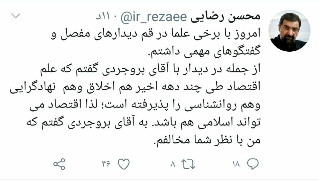 به گزارش گروه مجازی خبرگزاری صدا و سیما، سردار محسن رضایی دبیر مجمع تشخیص مصلحت نظام در صفحه شخصی خود در توئیتر نوشت: امروز با برخی علما در قم دیدارهای مفصل و گفتگوهای مهمی داشتم.