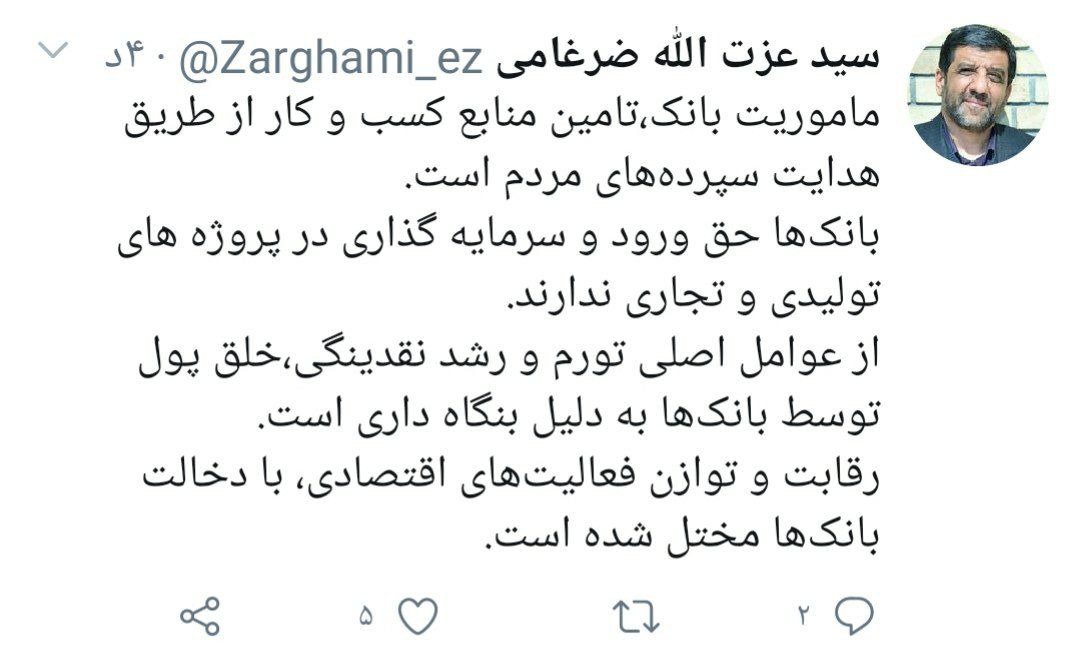 عضو شورا‌ی عالی انقلاب فرهنگی نوشت: بانک‌ها حق ورود و سرمایه گذاری در پروژه‌های تولیدی و تجاری ندارند.