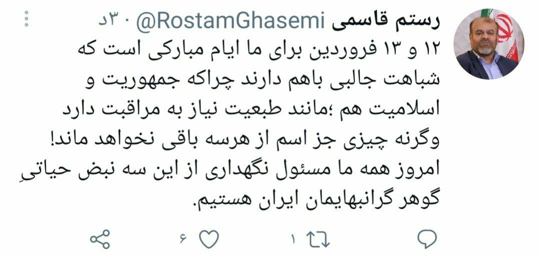 به گزارش گروه مجازی خبرگزاری صدا و سیما، رستم قاسمی وزیر نفت دولت دهم در صفحه شخصی خود در توئیتر نوشت: ۱۲ و ۱۳ فروردین برای ما ایام مبارکی است که شباهت جالبی باهم دارند چراکه جمهوریت و اسلامیت هم؛ مانند طبعیت نیاز به مراقبت دارد وگرنه چیزی جز اسم از هرسه باقی نخواهد ماند! امروز همه ما مسئول نگهداری از این سه نبض حیاتیِ گوهر گرانبهایمان ایران هستیم.