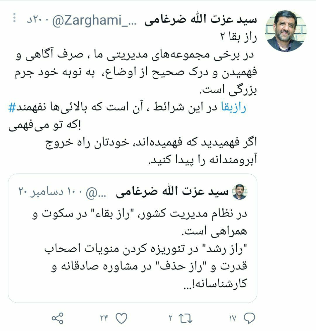 به گزارش گروه مجازی خبرگزاری صدا و سیما، سید عزت‌الله ضرغامی عضو شورا‌های عالی انقلاب فرهنگی و فضای مجازی در صفحه شخصی خود در توئیتر نوشت:‏‎‏ ‏راز بقا ۲