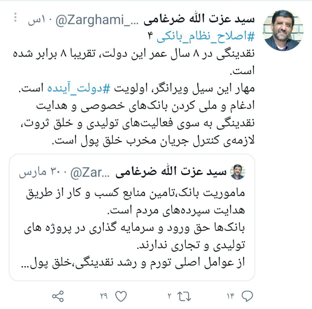 به گزارش گروه مجازی خبرگزاری صدا و سیما، سید عزتالله ضرغامی عضو شوراهای عالی انقلاب فرهنگی و فضای مجازی در صفحه شخصی خود در توئیتر نوشت: اصلاح نظام بانکی ۴