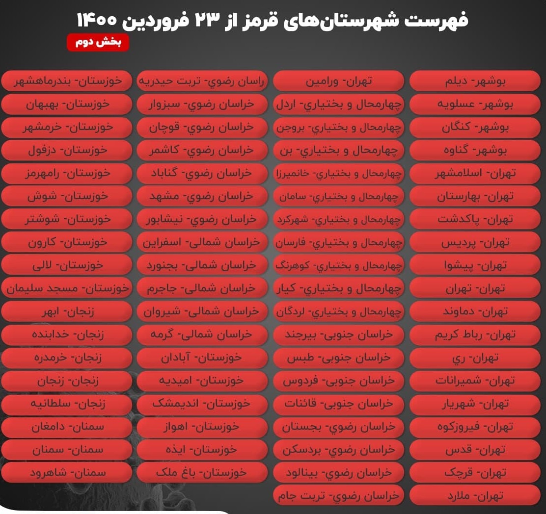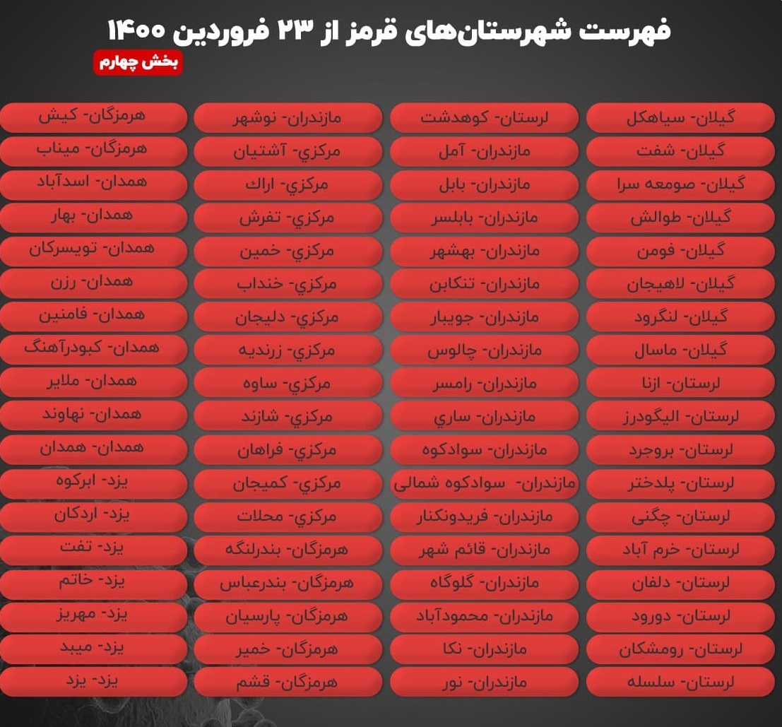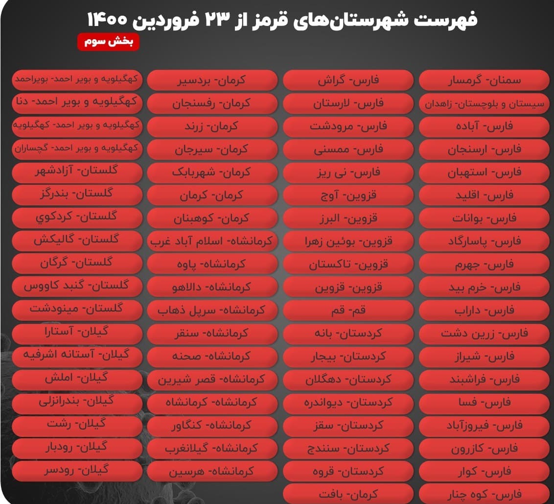 بر این اساس، شهرستانهای کلیبر و ملکان در آذربایجانشرقی، چالدران و سردشت در آذربایجانغربی، بیلهسوار، پارسآباد، خلخال، سرعین، گرمی و مشگینشهر در اردبیل، چادگان در اصفهان، اشتهارد در استان البرز، سیروان در ایلام، جم در استان بوشهر، قرچک و ملارد در تهران، خانمیرزا در استان چهارمحال و بختیاری، طبس در خراسان جنوبی، بجستان، بردسکن، تربتجام، تربتحیدریه و کاشمر در خراسان رضوی، جاجرم و گرمه در استان خراسان شمالی، سلطانیه در زنجان، استهبان، بوانات، پاسارگاد و نیریز در فارس، دهگلان در کردستان، بردسیر در کرمان، دالاهو و قصرشیرین در استان کرمانشاه، گالیکش در گلستان، سیاهکل، شفت و ماسال در گیلان، جزیره کیش در هرمزگان و اسدآباد در همدان نیز جزو شهرهای با وضعیت قرمز قرار گرفتند.